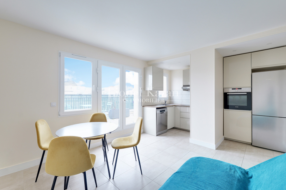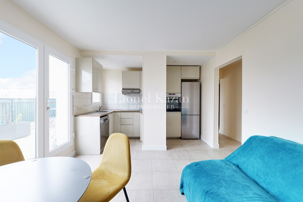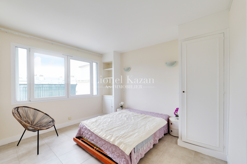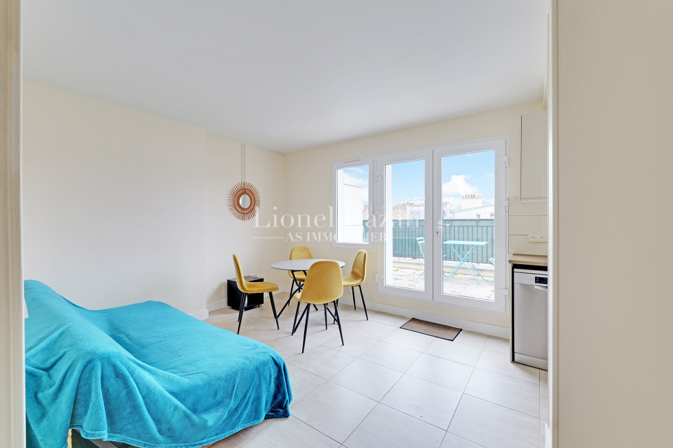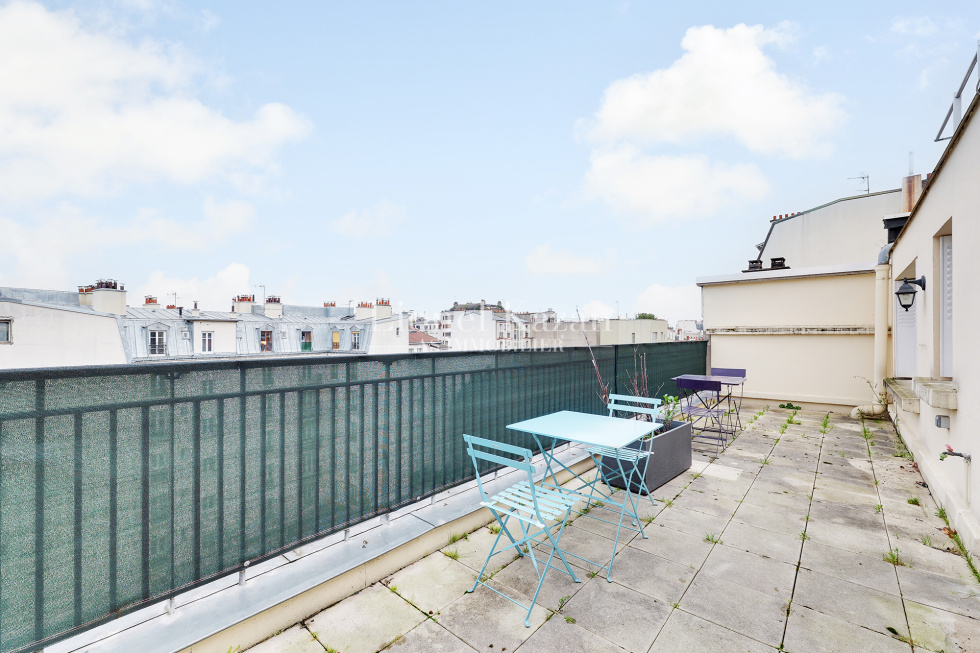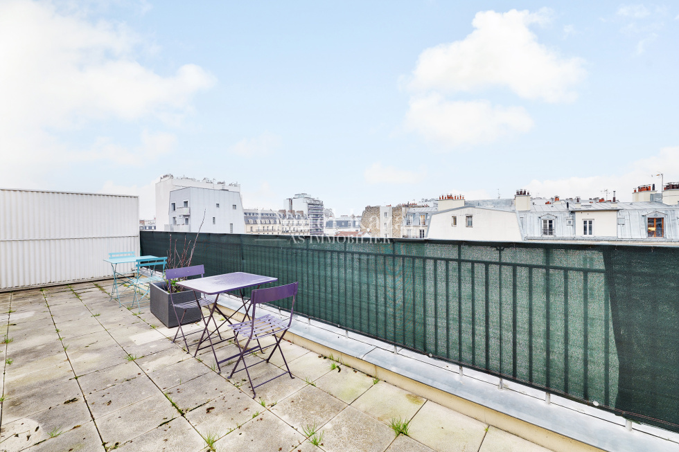 Villa Virginie une impasse au calme absolu, dans un immeuble récent au 7ème étage et dernier avec ascenseur un bel appartement de 44,92m2 loi Carrez en excellent état, isolé et fentêtres double vitrage, avec une terrasse de 22,25m2 (pondérée au 1/3 dans la surface annoncée) offrant une belle vue dégagée arborée et sur les toits de Paris se composant d'une entrée avec un placard, un beau séjour avec une cuisine équipée ouverte donnant sur la terrasse, une chambre avec placards, une salle de bains avec un wc, un dégagement avec un placard, un dressing. Chauffage et eau chaude inclus dans les charges Rare, Coup de coeur assuré IDEAL PIED A TERRE